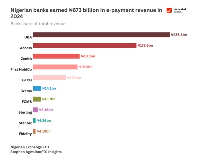 Ten of Nigeria’s biggest banks are reaping the rewards of the digital age. In 2024, they recorded a 58% jump in e-payment income, raking in ₦674 billion ($419.7 million) compared to ₦428.6 billion ($266.6 million) the year before.