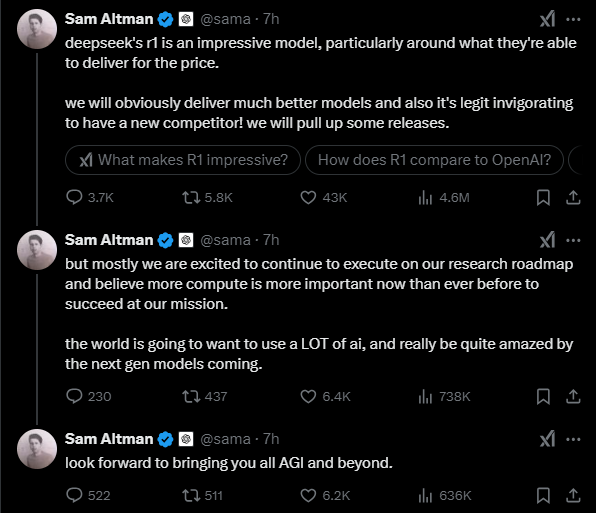 Altman described DeepSeek’s R1 model as “impressive,” particularly for what it achieves at such a low cost. He added that OpenAI would soon release better models and expressed excitement about the invigorating competition.